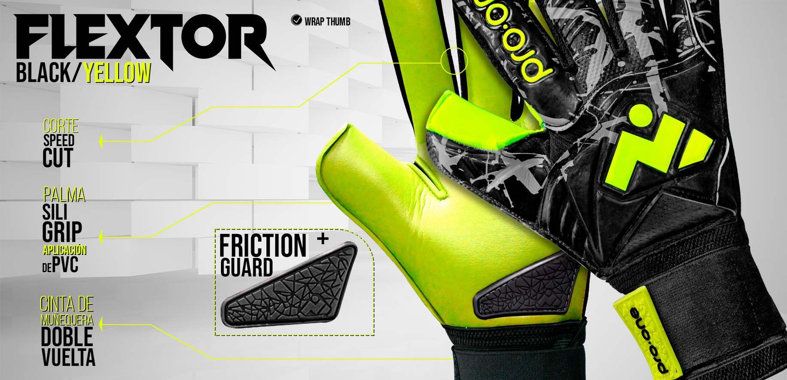 Guantes Pro-One Flextor en color negro y amarillo neón. Equipados con látex Sili Grip semiprofesional, 4 varillas fijas para mayor protección, con soporte de palma para mayor durabilidad. Corte Negativo para mejor ajuste.